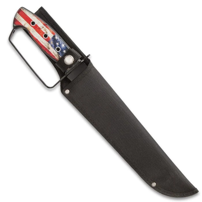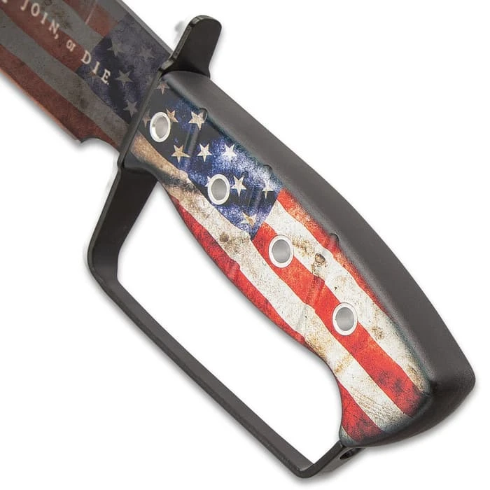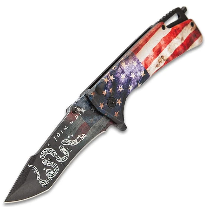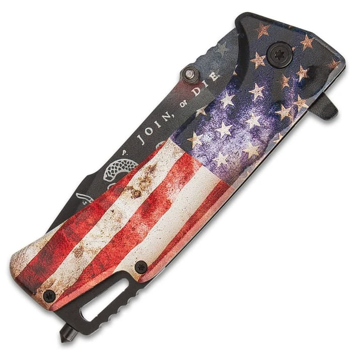 The American Flag Bowie And Pocket Knife Set is just about as patriotic as you can get with each knife proudly displaying American Flag artwork on its handle. Both of the keenly sharp blades are stainless steel with a black, non-reflective finish and a “Join or Die” laser-etch. The handles are aluminum with photograph quality American Flag artwork and the pocket knife has a glassbreaker. The fixed blade has a knuckle-buster handle and can be carried and stored in the included tough, nylon belt sheath. The pocket knife can be deployed using the flipper or a thumbstud to smoothly access the assisted opening mechanism. The 14 3/4” overall bowie knife has a 9 3/4” blade and the pocket knife has a 3 1/2” blade and is 4 1/2”, when closed.