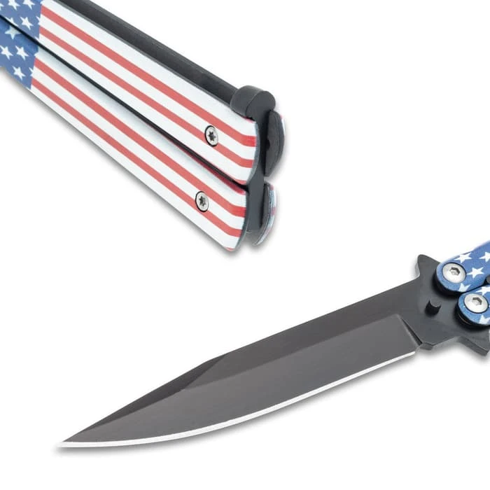 A patriotic addition to your knife collection, the American Flag Butterfly Knife is of an exceptional quality. Smoothly flip the knife with its sharp blade and balanced handles easily pivoting through the motions. The American Flag-printed handles will get attention when you pull the butterfly knife from your pocket.