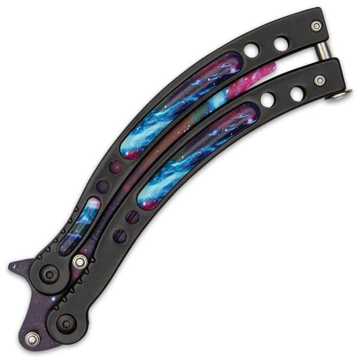 Black Galaxy Butterfly Trainer – Stainless Steel Blade, Water Transfer Design, Stainless Steel Handles – Closed Length 6”
