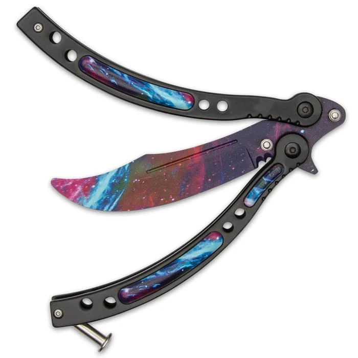 Perfect your flipping moves in cosmic style with our Black Galaxy Butterfly Knife Trainer or use for martial arts performances. Either way, you’ll look great using this colorful trainer. It has a 4 1/4” stainless steel trainer blade with a photography quality water transfer design of cosmic proportions. The blacke handles are of stainless steel with resin inserts that have the purple cosmic design to match the blade. The colorful butterfly trainer is 9 1/2” in overall length, 6” when closed and it has a secure handle locking mechanism.