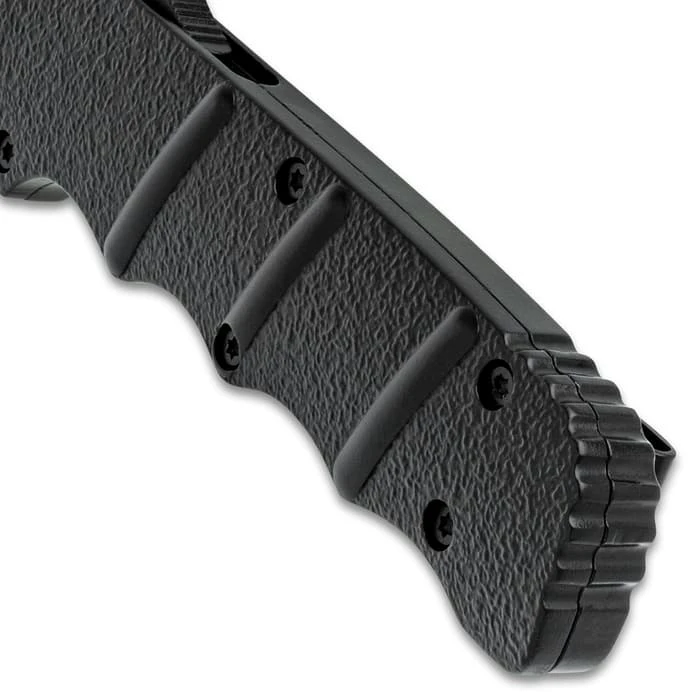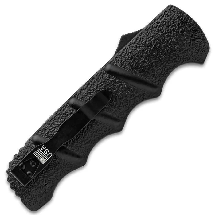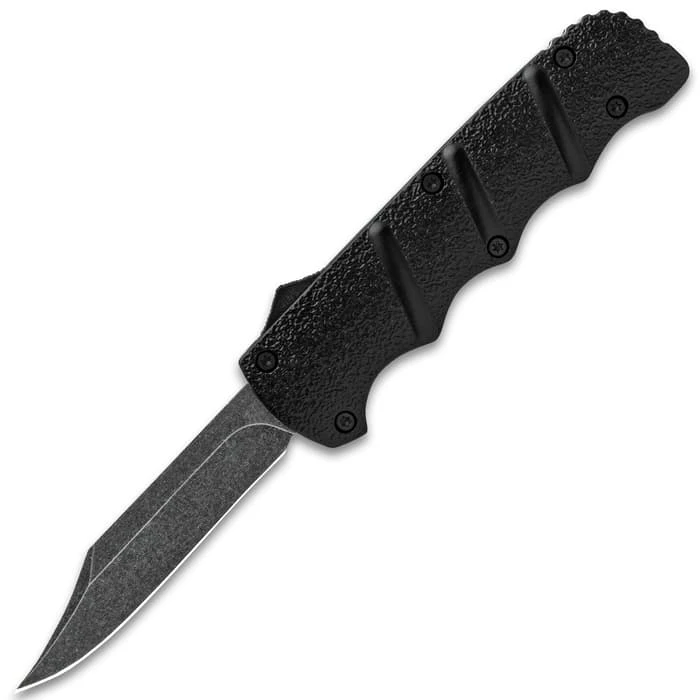 The Black Jacket OTF Automatic is built specifically for use in the worst environments. The black handle is not only heavily textured and has molded ridges, but also has a finger-grooved profile. This assures you of a secure grip in rain, sleet, snow or mud. The ready-for-action blade shoots out the front of the handle with just a pull of the slide trigger. The knife can be carried in its nylon sheath, which has a quick-release TPU buckle.