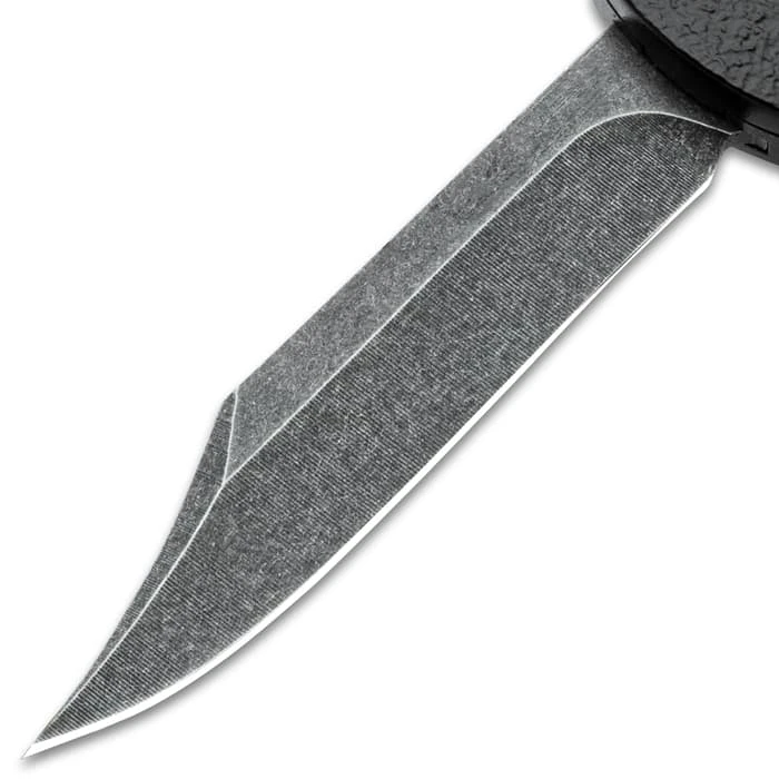 Black Jacket OTF Automatic Knife And Sheath – Stainless Steel Blade, Metal Alloy Handle, Pocket Clip – Length 8 3/4″
