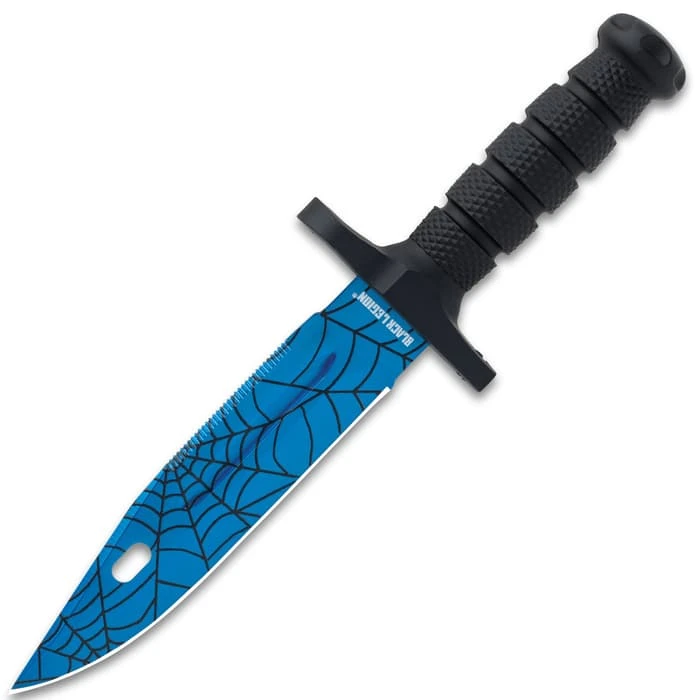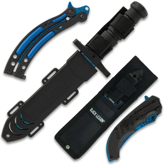 The Black Legion Blue Spiderweb Set is just packed with sharp and delicious goodies! You are getting a survival knife, three throwing knives, an assisted opening pocket knife and a butterfly trainer, all with eye-catching, blue stainless steel blades with a spiderweb pattern. The impressive survival knife has a beefy TPR textured and ridged handle with a heavy-duty guard. The 7 1/2” blade is razor-sharp and features partial serrations on the spine and a blood groove. It comes housed in a tough TPU leg and belt sheath. The ergonomic pocket knife has a grippy TPU handle with a pocket clip and a razor-sharp, 3 1/2” assisted opening blade with a thumbstud and flipper. The set of three throwing knives have cord-wrapped handles and 4 1/2” stainless steel blades with jagged cut-out edges and through holes. All of the throwing knives fit in a sturdy, nylon belt sheath. The butterfly trainer has locking aluminum handles with blue plastic accents and a stainless steel blunt trainer with no edge for safely practicing your flipping skills.