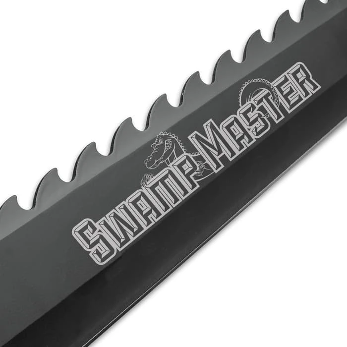 The Black Legion Swamp Master Machete Knife was built to ferociously tackle the densest vegetation and cut a path through any environment you are trekking through, whether it’s swamp, forest or backyard jungle. It has a razor-sharp, full-tang 18” stainless steel blade with a “gator tooth” spine and a black non-reflective finish. The tough TPU handle scales are textured to assure you of a no-slip, comfortable grip and a pommel lanyard is included. The 24” overall machete can be carried and protected when not in use in the included nylon belt and shoulder sheath.