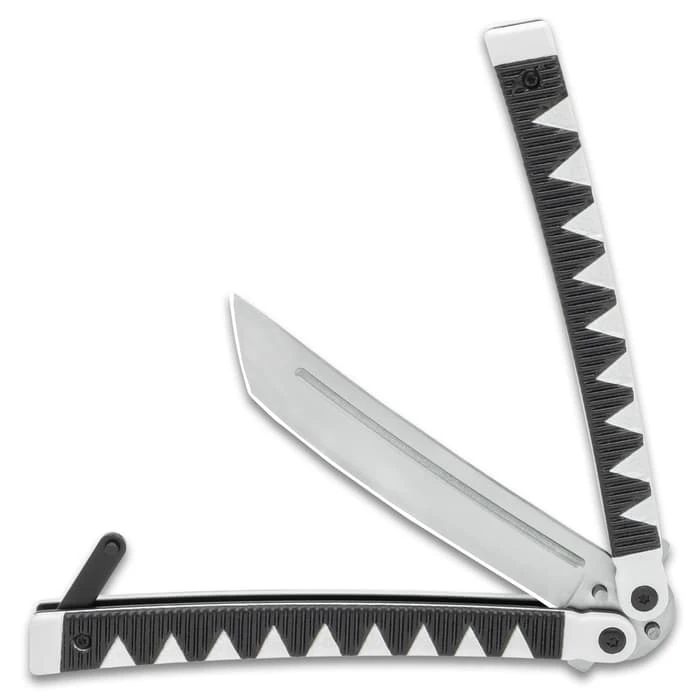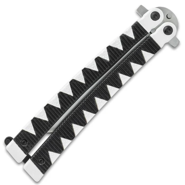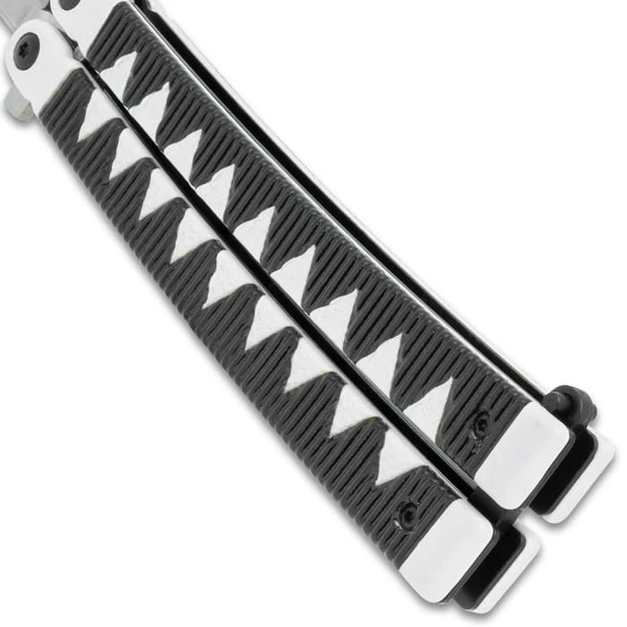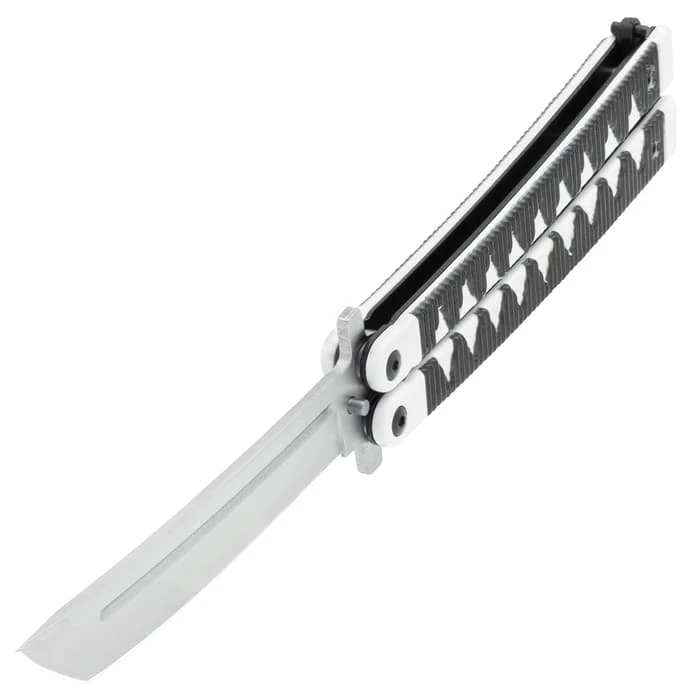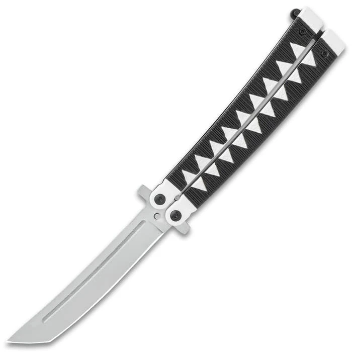 With handles that are designed to look like they are cord-wrapped in a Samurai sword style, the Black Samurai Butterfly Knife is worthy of the Japanese warrior. The blade also resembles a Samurai sword with its tanto edge. To lock the two handles together securely, there’s a sturdy latch lock.