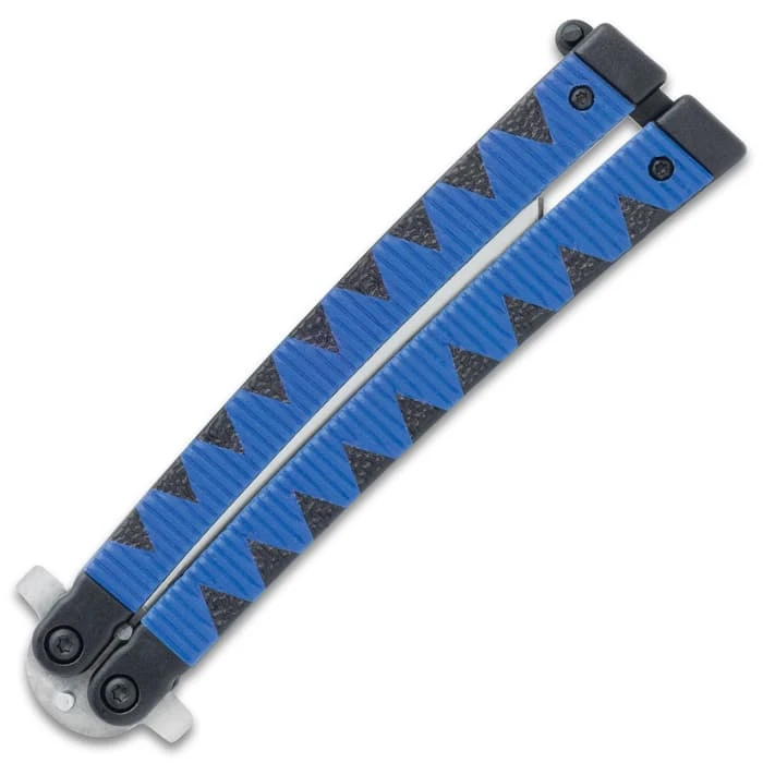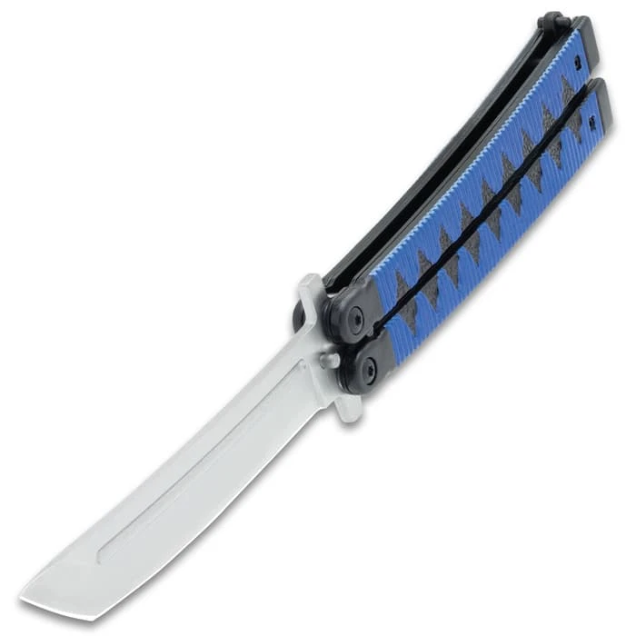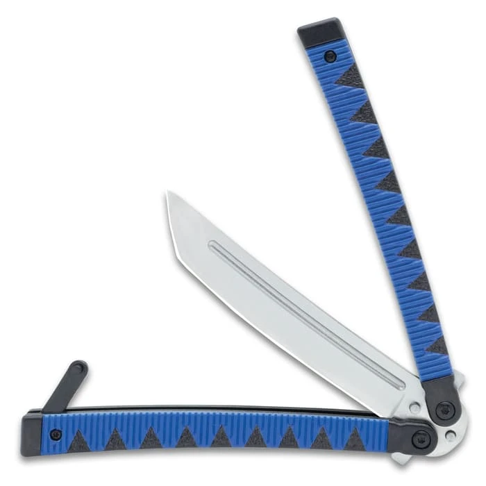 The Blue Samurai Butterfly Knife is definitely worthy of the legendary warriors that it was named for. The handle is crafted to look like it has been wrapped in blue cord like a Samurai’s katana. The blade has the traditional tanto profile of a katana. The butterfly knife has a latch lock that secures the handles closed when the blade is not in use.