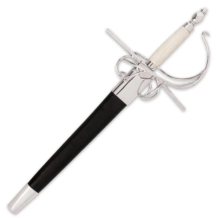 A beautifully crafted Rapier Dagger with a basket hilt is what you must have for your historic collection and this little beauty fits the bill perfectly. It’s a jewel with its chrome plated, high carbon steel blade that comes to the signature rapier point. It has a bone handle and is housed in a wooden scabbard which is covered by genuine black leather.