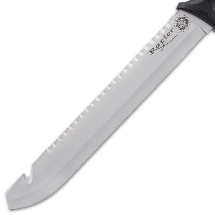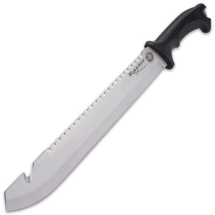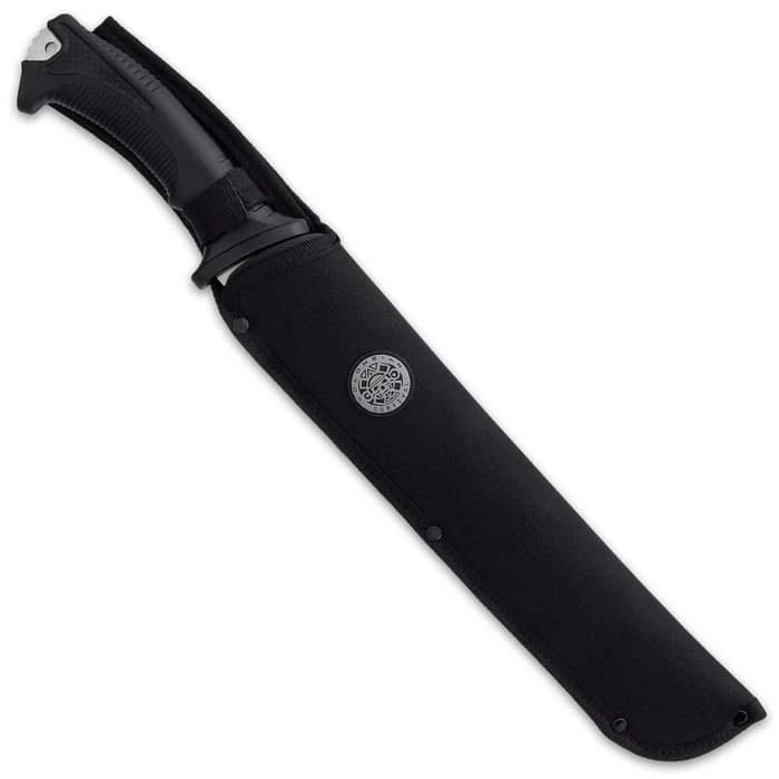 Brave your backyard or the wild with our Colombian Raptor Black Machete! It has a ferocious 11 3/4” 3Cr13 stainless steel blade which has a sawback and gut hook. There’s no denying that this machete is up to any job you put in front of it! The ergonomic black ABS handle is built to last and gives you a firm grip when you’re working the blade. It also has a lanyard hole. A tough nylon belt sheath protects the blade and lets you carry the machete anywhere.