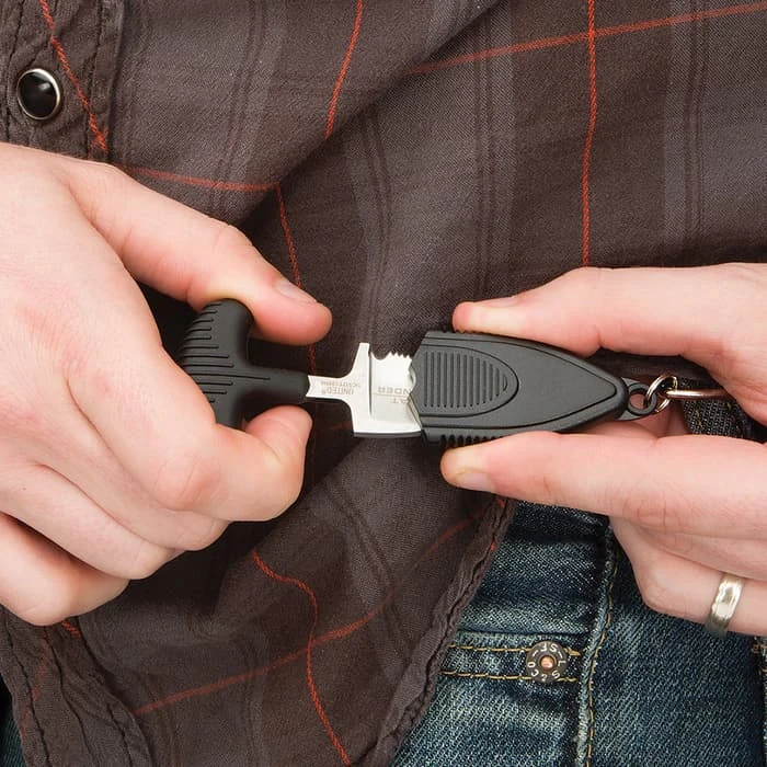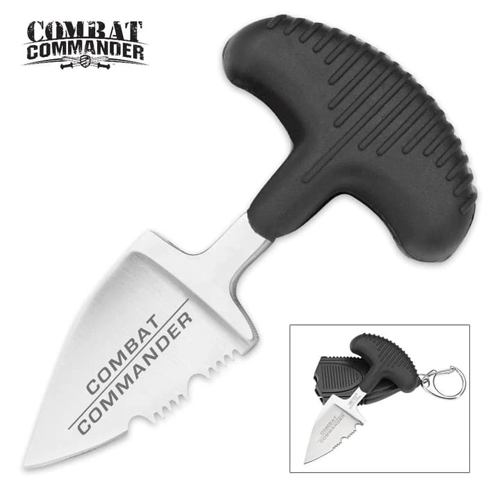 The Combat Commander Mini Push Dagger is the best little self-defense friend youβll ever have! When we say itβs discreet, weβre not kidding! The push dagger is 2 3/4β overall and has a stainless steel blade with prominent serrations. It may be tiny but it does mean business. The push handle is strong TPR rubber and has a comfortable, no-slip grip. The blade is housed in a polypropylene sheath with a stainless steel clip and ring so that it can be easily clipped wherever you need it. It fits perfectly on your keychain.