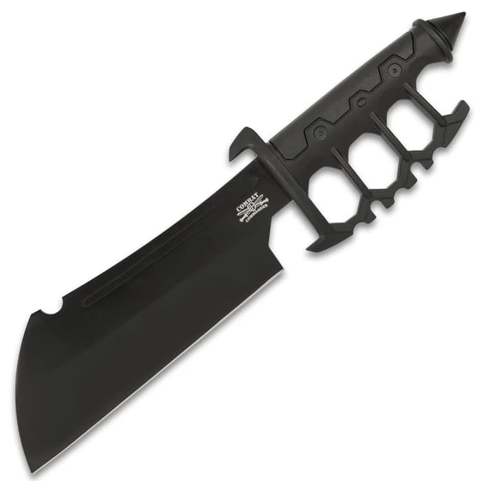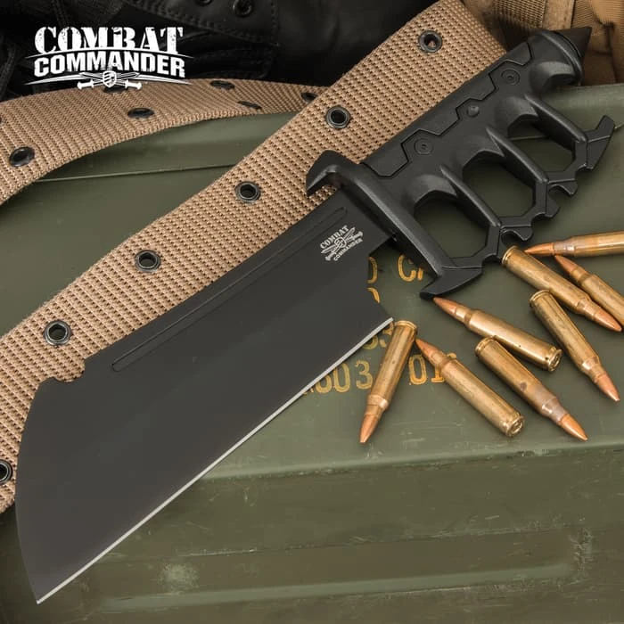 Combat Commander Trench Cleaver Knife And Sheath – 1065 High Carbon Steel, Non-Reflective, Cast Metal Handle – Length 12 7/8”
