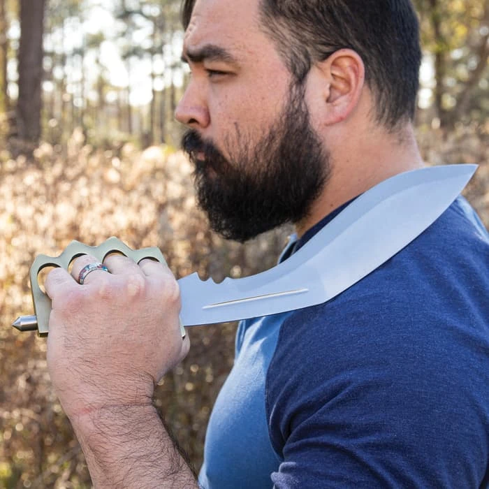 The 1918 Combat Kukri Trench Knife takes a tried and true classic fixed blade to a new level of battle-ready. The ready-for-action kukri knife has a 11 1/2”, razor-sharp 1095 carbon steel, curved blade that features a blood groove. The trench knife has a solid brass knuckle guard handle with an antiqued finish and “U.S. 1918” deep stamped into it. The kukri trench knife is 16” in overall length and slides into the included heavy-duty, genuine leather sheath.