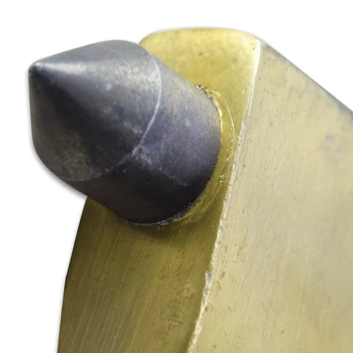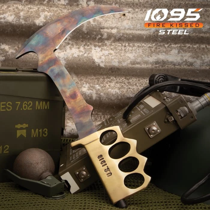 The Combat Sickle Trench Knife is a unique and inspired reimagining of the classic WWI icon that has made its mark in history and remains relevant today. The vintage-look knife has an 8” Fire Kissed 1095 carbon steel sickle head with a 5 1/2” blade, featuring a distressed patina. The sickle trench knife has a solid brass knuckle guard handle with an antiqued finish and “U.S. 1918” deep stamped into it. The handle’s pommel features a pointed skullcrusher. The sickle trench knife is 15” in overall length and slides into the included heavy-duty, genuine leather sheath.