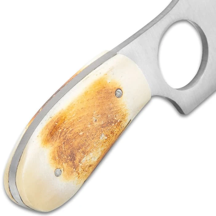 This Coon Skinner provides a curved cutting edge with a sharp point. It’s ideal for cutting, slashing and skinning strokes. Features a 3 1/2″ AUS-6 stainless steel blade and natural bone handle scales. Includes a custom leather sheath with a belt loop and a snap button closure.