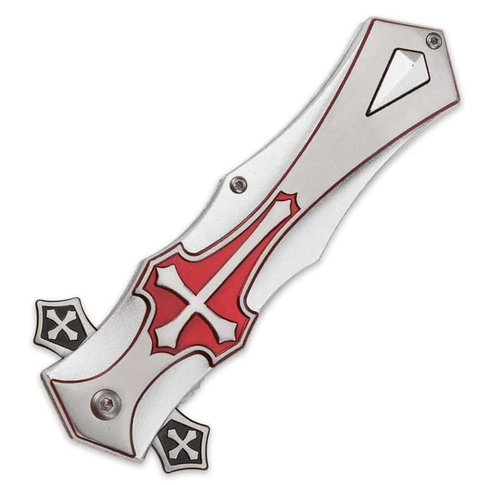 The Crusaders Aluminum Assisted Opening Pocket Knife has a distinct look that has both Medieval and Gothic appeal. It features a 4” two-tone stainless steel blade and is assisted opening for easy deployment. The aluminum handle features a cross medallion set on a red background. It has a pocket clip for convenient carry.