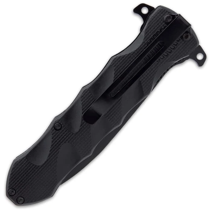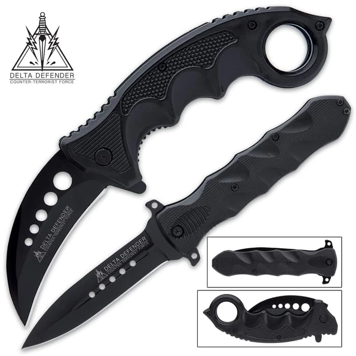 The assisted opening knives in the Delta Defender Knife Set has an all-black, non-reflective appearance perfect for covert ops. Each has a razor-sharp, 4β stainless steel blade with thru-holes that can be quickly deployed with a flipper. The handles are textured TPU with finger-grooves for a secure, no-slip grip and feature pocket clips. The karambit is 5 1/4β, when closed, and the stiletto is 5β, when closed, making them great EDCs.