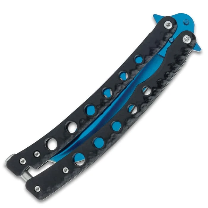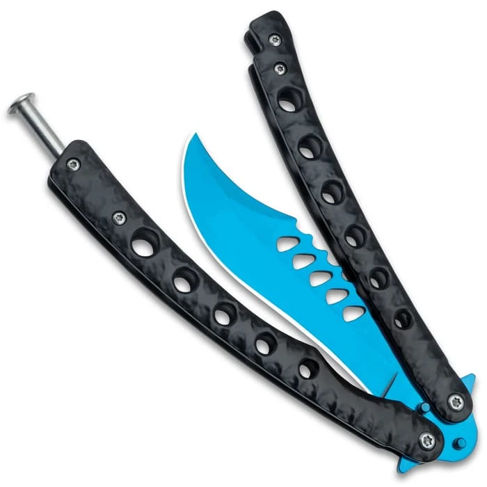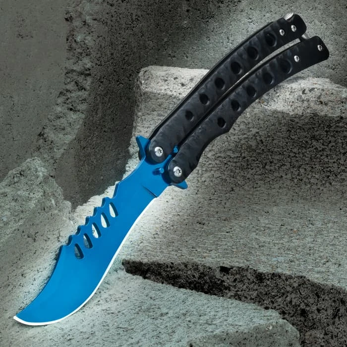 Electric Blue Butterfly Knife – Stainless Steel Blade, Stainless Steel Handle, Latch Lock – Length 9″