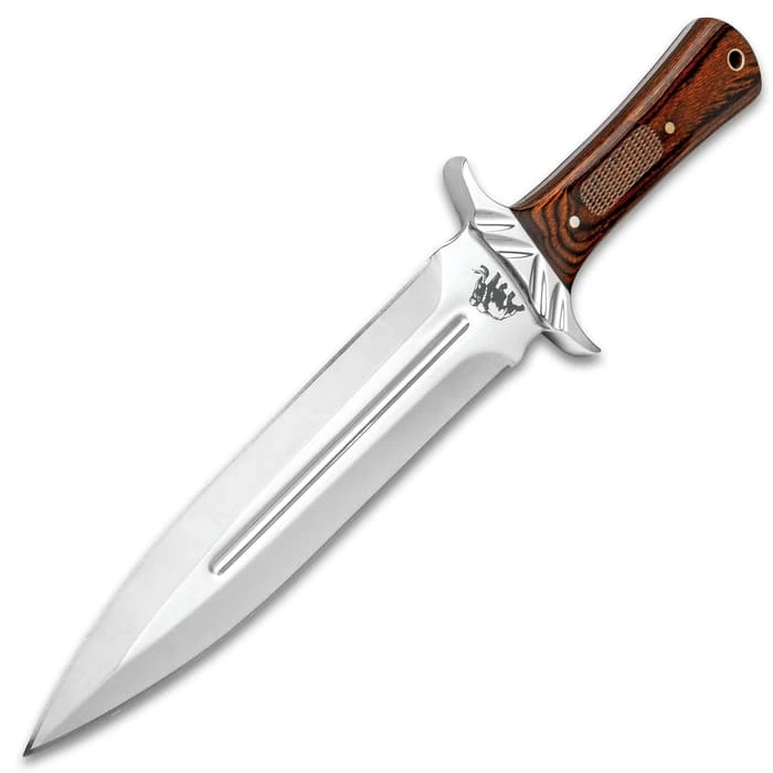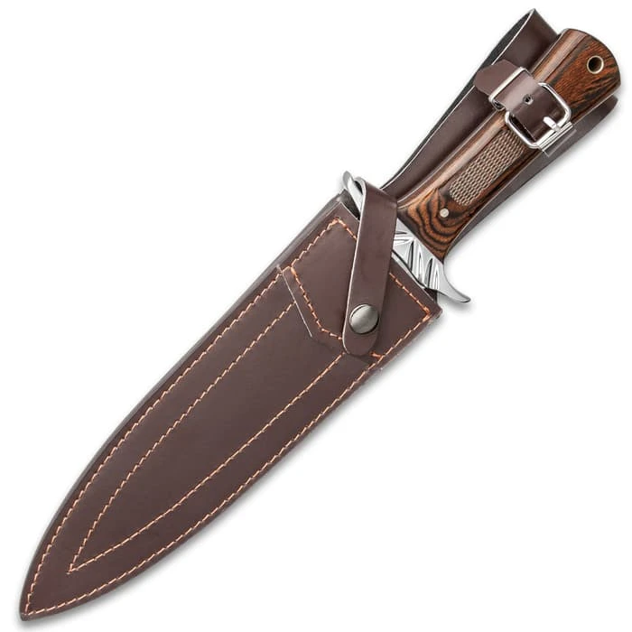When facing the wilds of North America, back when trading posts were established by the Hudson Bay Company, a trapper needed a knife that would be a weapon and a tool. The Fur Trader Toothpick Knife would have been the knife they preferred. The full-tang, 9 1/4” double-edged stainless steel blade is razor-sharp and features a mirror-polished finish and blood groove. The handle scales are made of dark brown wood and are secured with brass pins and the handguard is stainless steel. The 14 3/4” bowie knife slides securely into a premium leather belt sheath with a buckle strap and a snap closure.