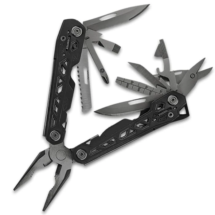 The Black Truss is an all-inclusive multi-tool, with 17 tools built to the exacting needs of the professional user in a size-conscious design. This full size multi-tool aims to remove excess heft while keeping all of the functionality. The result is a professional-grade multi-tool that bridges the gap between the problem and the solution. The optimized tool pack is edited to remove unused tools and include much-requested ones. The tools include standard pliers, wire cutter, a 2 1/4” fine edge blade, a 2 1/4” serrated blade, scissors, saw, real cross driver, small flathead, medium flathead, large flathead, can opener, bottle opener, awl, file, ruler, wire stripper and spring-loaded needle nose pliers. The needle nose pliers are spring-loaded to lessen hand fatigue for the user. The handle is constructed from one single piece of steel, allowing for additional strength in a slimmer design and features a lanyard hole and tool lock. The Truss is built to handle any and all tasks thrown at it: at the job site, around the house, and everywhere in between.