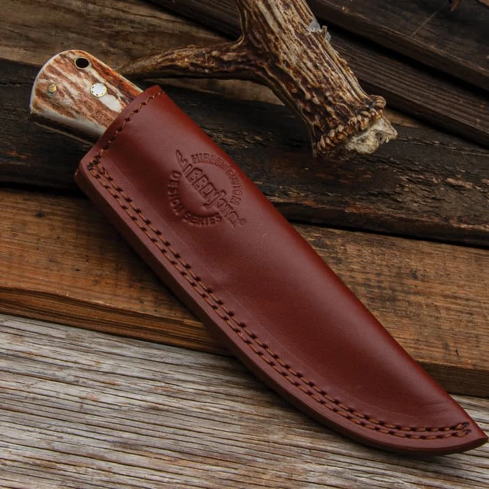 Ever since Gil Hibben’s easy-to-carry Diamondback Fixed Blade came onto the scene, it has continued to be a popular choice for an everyday carry fixed blade knife. On the tails of its success, Hibben has done it again with a version that has an attractive, genuine stag handle. Just as comfortable at your side as its predecessor, the knife is only 7 7/8” overall, which fits like a glove in its premium leather belt sheath. The blade is 3 5/8”, crafted of German 1.4116, with brass fileworked accents running the length of the full-tang and extending from a nickel-silver bolster with a high-polish finish. The handle scales feature mosaic pin accents and are secured with nickel silver pins, along with a brass lanyard insert.