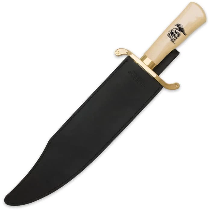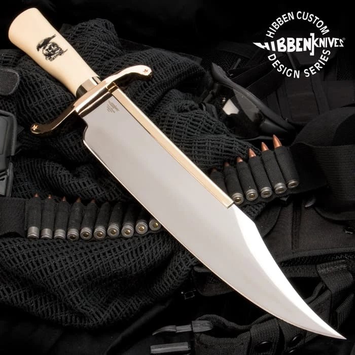 Master knife maker Gil Hibben designed this bowie for the 2010 blockbuster “The Expendables.” This cutlery masterpiece is sure to add some punch to your collection! It has a polished 14″ 3Cr13 stainless steel blade and a synthetic ivory handle with “Expendables” artwork. It features a gold plated blade catcher and guard. A custom leather sheath with the Hibben Knives logo is included.
