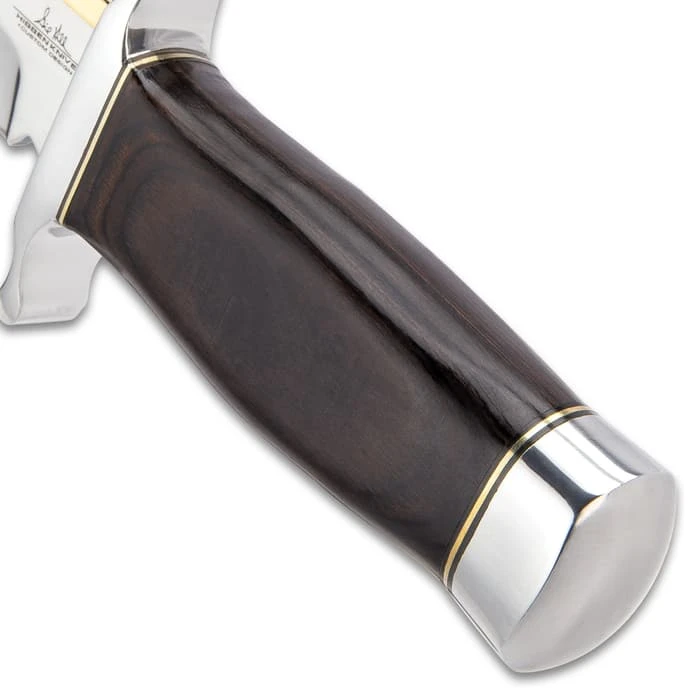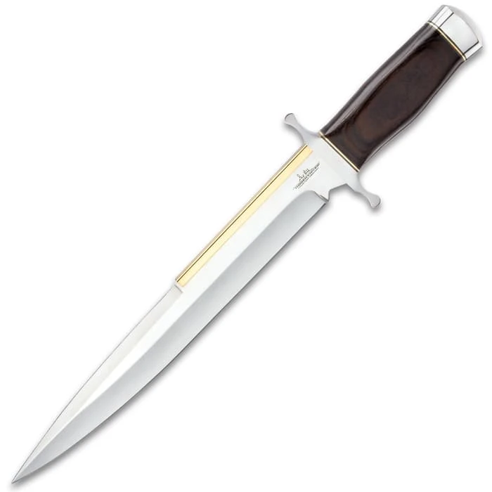Gil Hibben has a history of designing knives for Sylvester Stallone to feature in his films, going back to the “Rambo III” Bowie. Stallone is an avid collector of Gil’s custom knives, and that relationship continued when Stallone commissioned Gil to make several knives to use in his new film, “The Expendables.” One of these movie star knives was a never-before-produced, custom designed Old West Toothpick. This handsome, versatile fixed blade knife features a classic 11 7/8″ Arkansas toothpick style blade, brass-plated blade back and classic hardwood handle. It includes a handsome genuine leather sheath and certificate of authenticity. Measures 17 1/2″.
