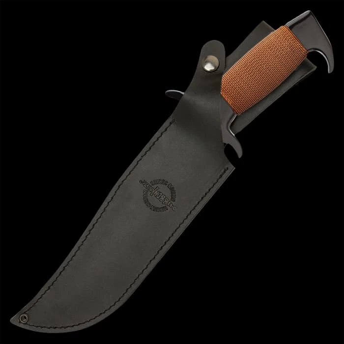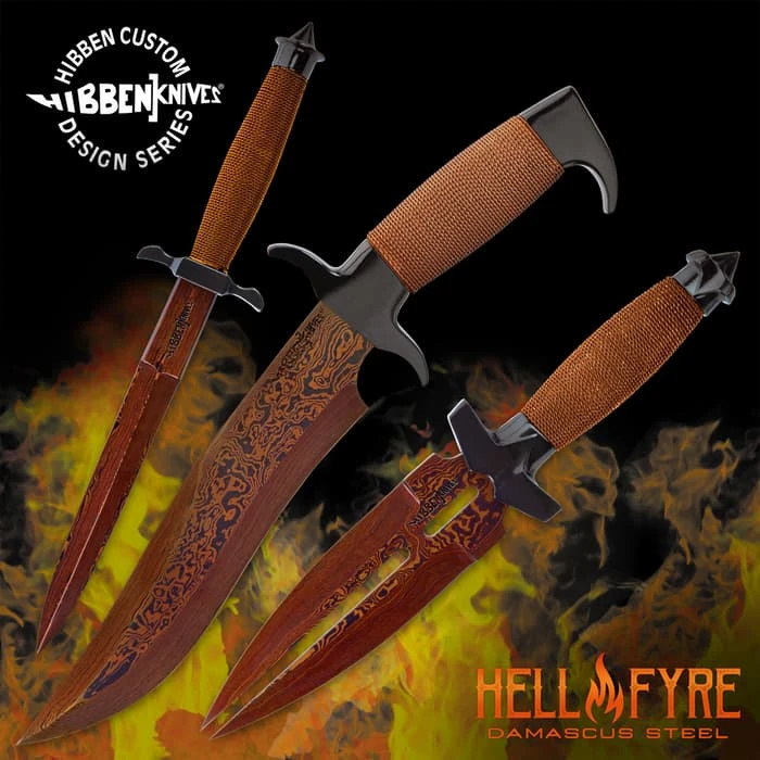 Hibben HellFyre Knife Collection – Damascus Steel Blades, Wire-Wrapped Handles, Black Metal Guards, Leather Belt Sheaths