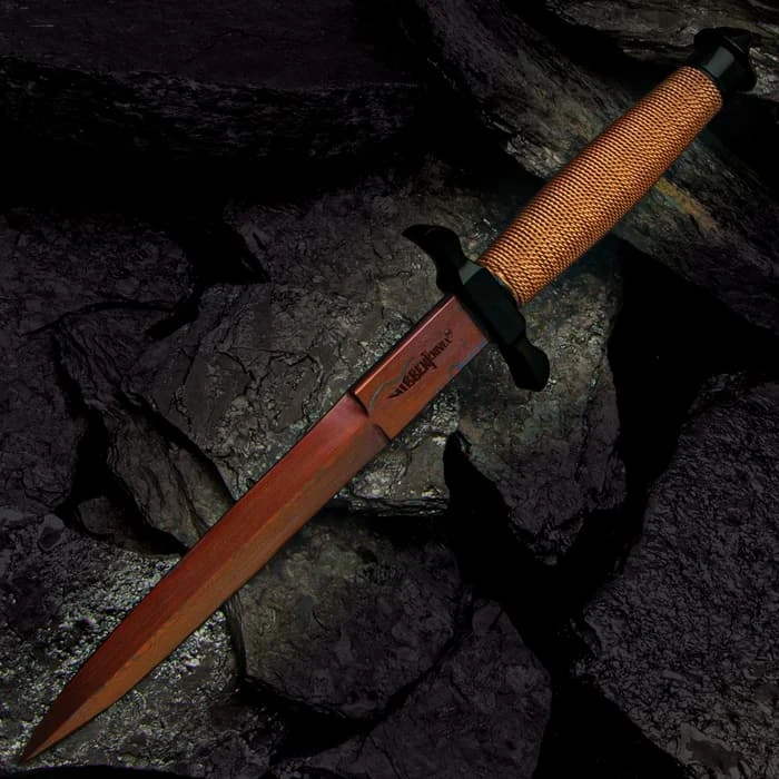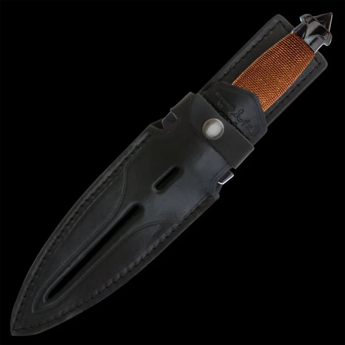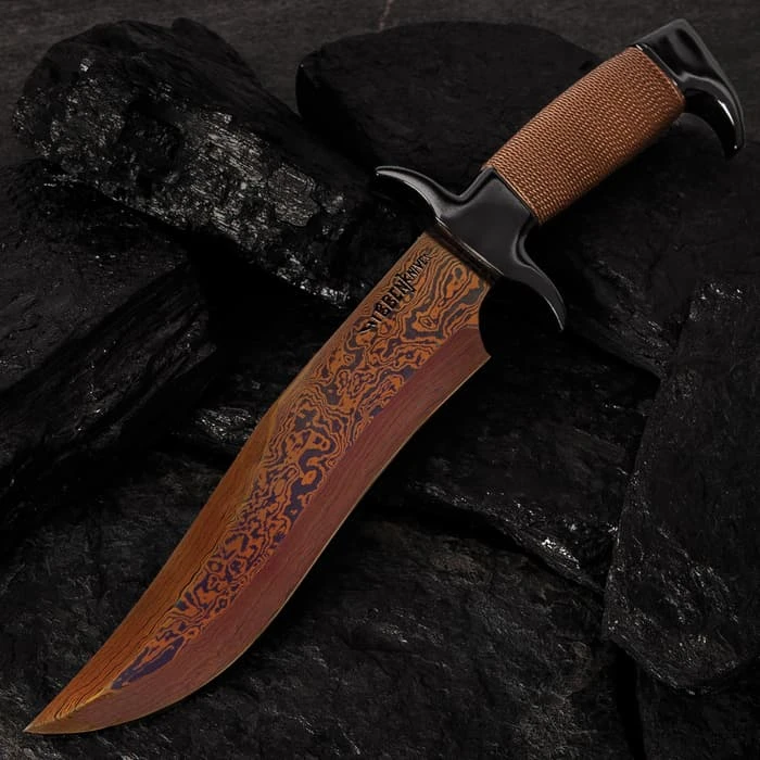 If you only buy one Gil Hibben masterpiece for your collection this year, the Hibben HellFyre Knife Collection is absolutely the purchase you need to make! It’s not just the fact that this is a collection of legendary knife designer Gil Hibben’s knives, it’s the fact that the knives also have HellFyre Damascus blades. Pure innovative genius, the exclusive forging process, used on the blades, produces visually striking black Damascus steel with a fiery pattern. In this collection, you’re getting the HellFyre Bowie, the HellFyre Shadow Knife and the HellFyre Double Shadow Knife. The 13 1/2” overall bowie has an 8 3/4” blade that extends from a hefty, metal handguard with a black chrome finish. The handle is wrapped in copper-colored wire and the pommel is black, chrome-finished metal. The 12 1/4” overall fixed blade has a 7 1/4” dagger-style blade, extending from a metal handguard with a black chrome finish. The handle is wrapped in copper-colored wire and the skull-crusher pommel is black, chrome-finished metal. The 11 1/4” overall split-blade knife has a 5 1/2” blade that’s split into two penetrating points with razor-sharp edges. It, too, has a copper-colored, wire-wrapped handle, bookended by a black, chrome-finished metal handguard and skull-crusher pommel. Each of the knives comes with a genuine leather belt sheath. The Hibben HellFyre Knife Collection is a must-have! No ifs, ands or buts!