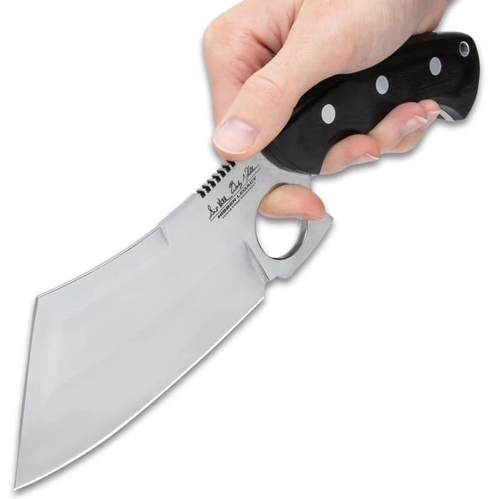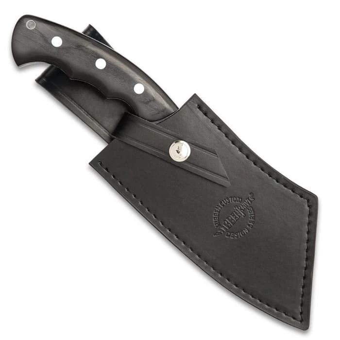 Knife Masters Gil and Wes Hibben continue to put out innovative designs, which become legends in their own right! The Hibben Legacy Ebony Cleaver Knife is all about having supreme control from the finger-grooved handle that fits comfortably in your palm to the finger ring integrated into the capable blade design. It has a 5 7/8”, full-tang 5Cr15MoV stainless steel cleaver blade with a mirror-polished finish and beveled edges. The black linen Micarta handle scales are secured to the tang with heavy-duty stainless steel pins and there is a lanyard hole. The 10 3/4” overall cleaver knife can be carried and stored in its premium black leather belt sheath, which has the Hibben Knives logo.