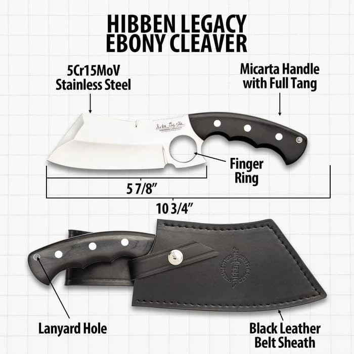 Hibben Legacy Ebony Cleaver Knife With Sheath, Black Linen Micarta Handle Scales – Length 10 3/4”