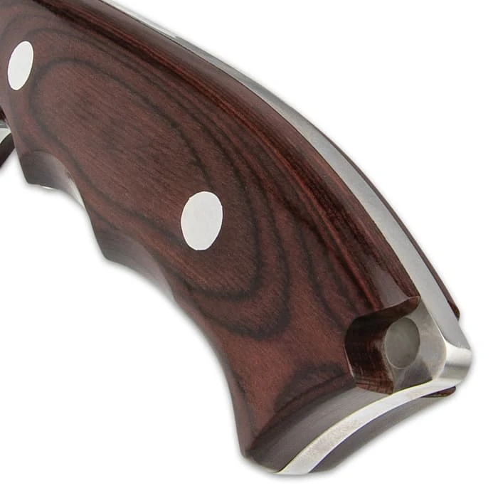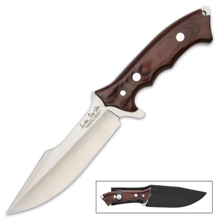 Renowned knifemaker Gil Hibben has been designing and producing top quality edged collectibles for more than 50 years. His son, Wesley, has been making and designing custom knives for more than 25 years. The two have teamed up to create a priceless collection of knives, which now includes the Hibben Legacy Fighter IV. It has a full-tang, 6 1/4” 5Cr15MoV stainless steel blade with a mirror-polished finish and the tang extended into a lanyard hole. The finger-grooved, brown pakkawood handle scales are attached to the full-tang with large stainless steel pins. The 12 1/8” overall knife can be stored and carried at your side in a leather belt sheath, embossed with the Hibben logo.
