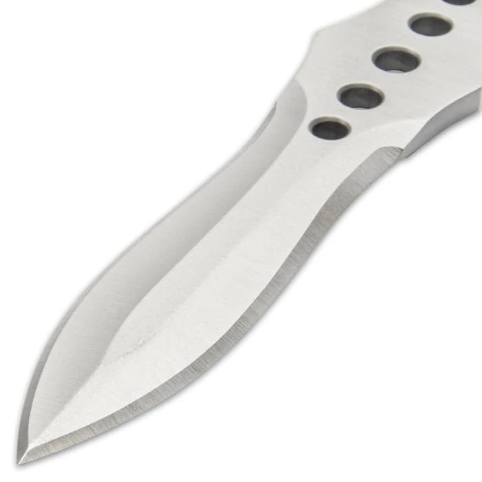 As a member of the International Knife Throwing Hall of Fame, Gil Hibben knows throwing knives and what design elements are necessary for the perfect throw. Perfect your throwing skills with the Hibben Three-Piece Master Thrower Set. Each 8” overall knife is one-piece of 3Cr13 stainless steel with a 3 3/4” double-edged blade with a penetrating point. The handle is comfortably curved and there are five weight-reducing thru-holes, and it comes to a thick point at the end. All three of the throwing knives fit in a tough nylon belt sheath with a snap strap that secures the handles.