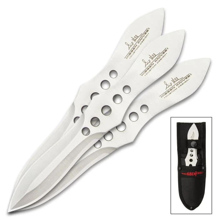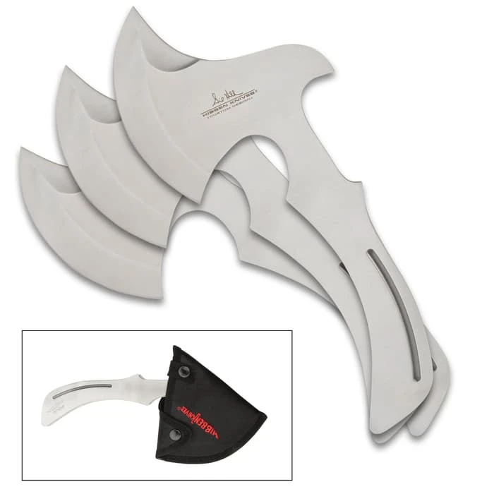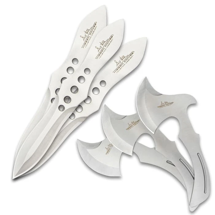 If you want to improve and perfect your throwing skills, you need to use throwers designed by the throwing master. Gil Hibben is a member of the International Knife Throwing Hall of Fame and knows what is necessary for the perfect throw. We’ve put together our Hibben Throwing Axe and Knife Set as a value-packed deal on the best throwing tools on the market. You’re getting three axes and three knives, all with a one-piece, tempered 3Cr13 stainless steel construction. Each of the 10” overall axes has a 4 1/4” upswept edge and each of the 8” overall knives has a 3 3/4” double-edged blade. All of the throwers have razor-sharp edges and penetrating points. Both the axes and the knives have a curved-grip design that is comfortable, giving you the same accurate and consistent release each time they’re thrown. A tough nylon belt sheath is included with each set of throwers for convenient storage and carry.
