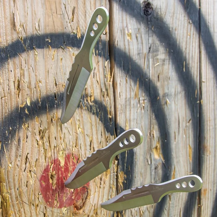 Hibben Throwing Knives Triple Set With Sheath – One-Piece 3Cr13 Stainless Steel, Clip Point, Through Holes