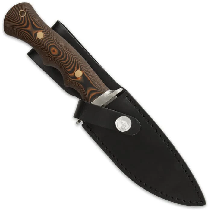 This knife was designed by master knife maker Gil Hibben, an avid hunter and fisherman. His firsthand experience as an Alaskan hunting guide contributed to the design of this custom knife. It has a 4 5/8” razor-sharp 420HC stainless steel blade with a satin finish, complemented by a stainless steel guard. The handsome CNC machined, G10 handle scales are secured to the tang by brass pins and the handle features a lanyard hole. The 9 5/8” overall length, fixed blade knife slides securely into a premium leather belt sheath with a handle strap. When it comes to knives, Gil Hibben always knows exactly what you need!