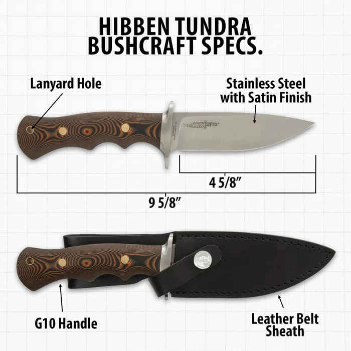 Hibben Tundra Bushcraft Knife And Sheath – 420HC Stainless Steel Blade, G10 Handle Scales, Stainless Guard