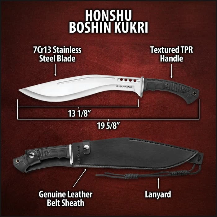 In the span of just a few years, Honshu’s remarkable “Boshin” cutlery line has skyrocketed to international renown and acclaim, gaining a diverse following numbering in the thousands. From tactical cutlery fanatics to staunch devotees of ancient Japanese swordcraft, blade enthusiasts of all stripes share a common love and respect for Boshin swords and knives, lauding their unique blend of tradition and innovation, style and function. The legendary Nepalese kukri is the latest historic blade to undergo the “Boshin transformation.” Just as it did with the katana, wakizashi and bowie, Honshu rejuvenates and redefines this centuries-old machete variety, adapting it to suit the unique challenges of modern combat and outdoor adventure.