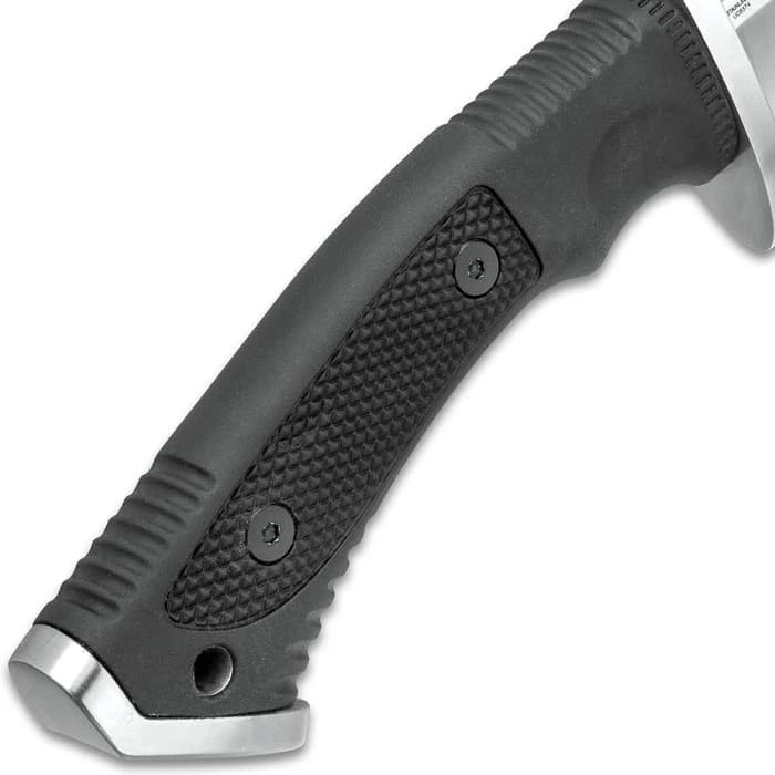 The Conqueror Bowie Knife is an exceptional addition to Honshuβs rock solid tactical weapon line. Always innovative and always at the forefront of the industry, United Cutleryβs blades are meant for real world use so, their construction has a strength and quality that cannot be matched! This bowie knife has a 10 7/8β 7Cr13 stainless steel blade with a phenomenally sharp edge and double blood grooves. The hefty stainless steel guard in front of the grippy handle provides a slight buffer from your hand and the blade. The ergonomic TPR injection handle has grid-texture on both sides and ridging so that youβre guaranteed a secure grip, plus, a brass lanyard hole offers another carry option. The 16 1/2β overall bowie knife fits like a glove in its reinforced leather belt sheath that also features a lanyard cord.