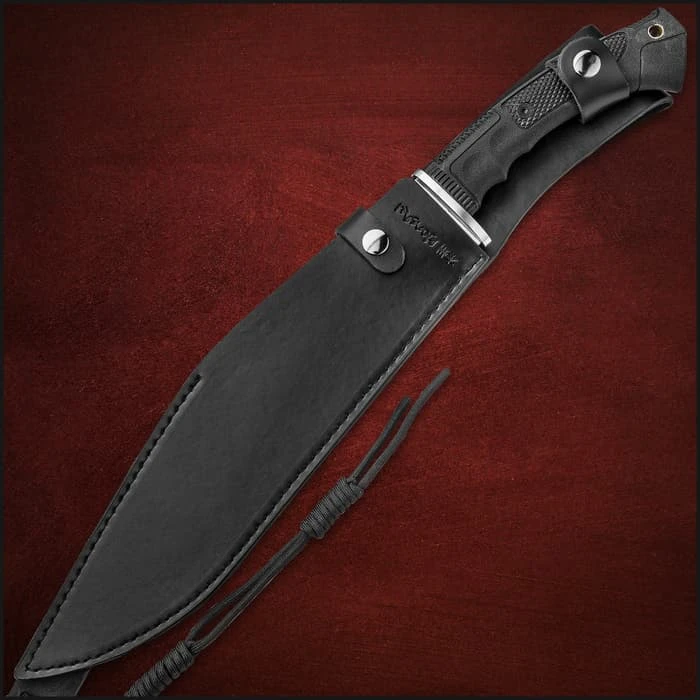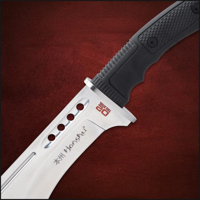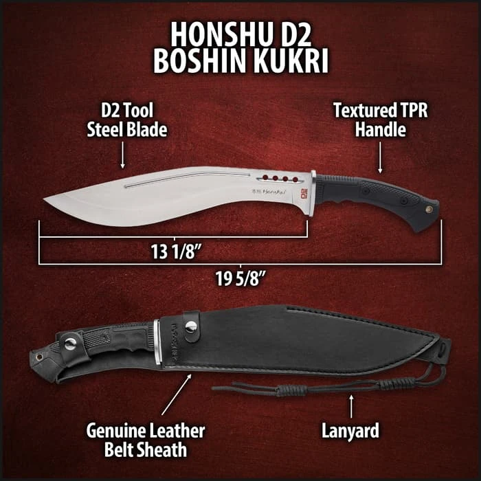 Honshu D2 Boshin Kukri And Sheath – D2 Tool Steel, Thru-Holes, Molded TPR Handle, Lanyard Hole – Length 19 5/8”