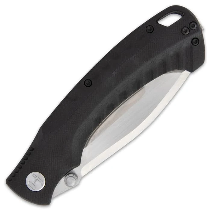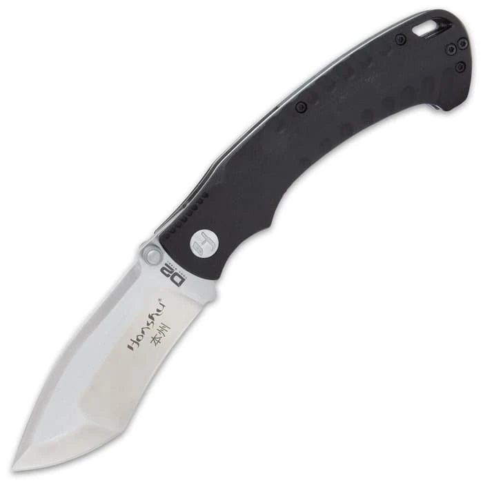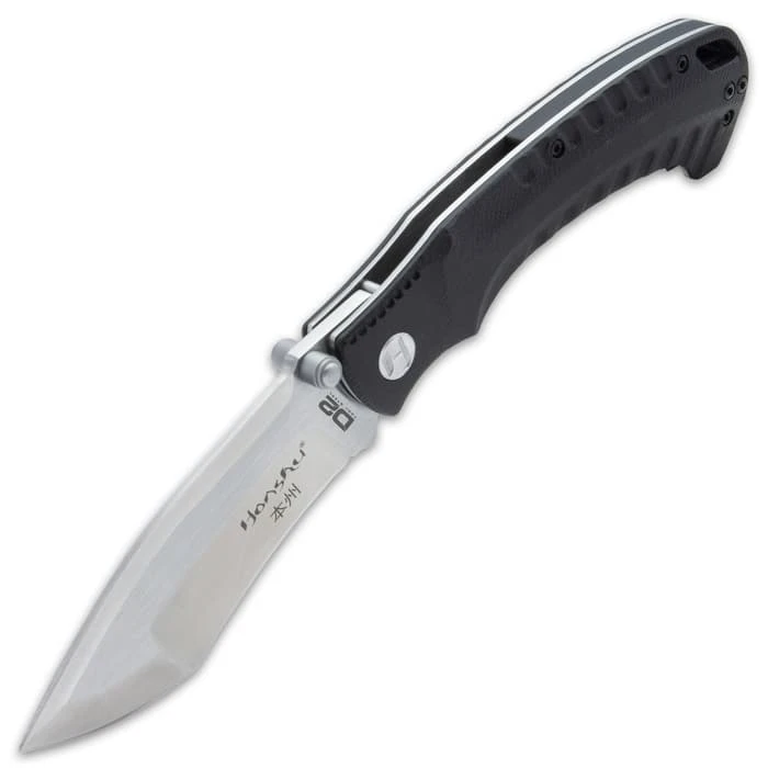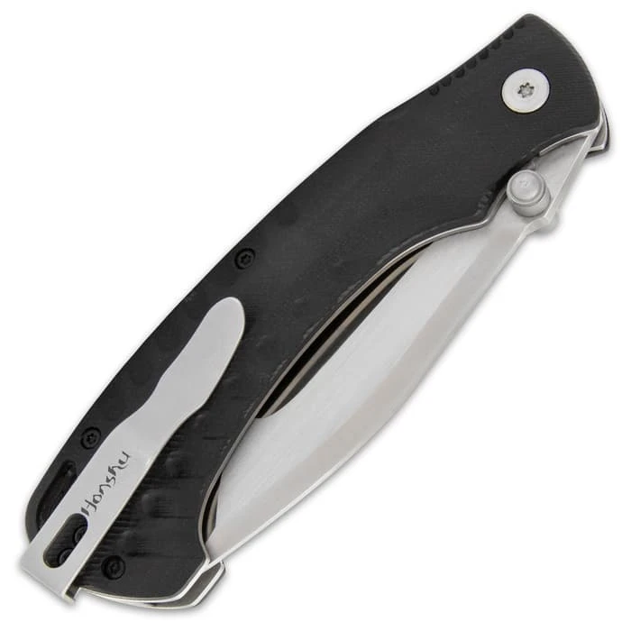 Honshu, known for its incredible line of tactical swords, continues to release innovative pieces that are a savage blend of style and function. The Senjutsu Ball Bearing Opening Pocket Knife is the tactical knife that you’ve been looking for to get the job done on whatever mission you take it. The knife has a 3 1/2”, D2 tool steel blade with a satin finish, and can be deployed using the flipper to activate the ball bearing opening. Our official D2 stamp assures you that you’re getting a blade that holds its edge, is perfectly balanced and is as tough as nails. No other company can compete with the superior quality of a Honshu blade. The black G10 handle scales have CNC shaped grooves for a slip-free grip and the liners are bead-blasted stainless steel. The tactical pocket knife is 4 3/4”, when closed, and it has a stainless steel pocket clip and also features a lanyard hole.