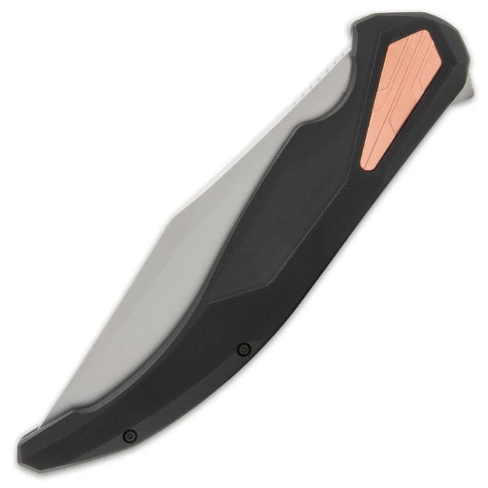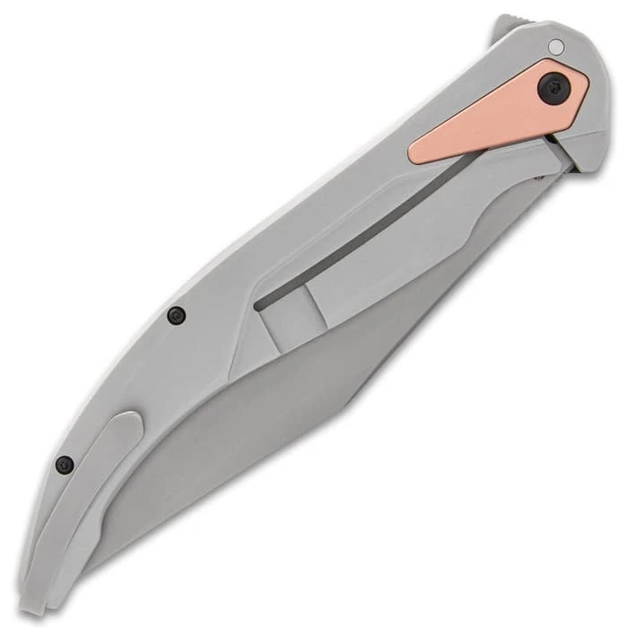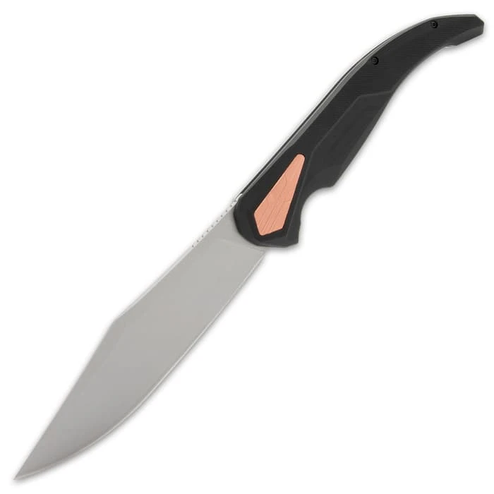 Compared to the standard Strata, the XL version adds more size to this modern version of traditional Navaja designs. In 19th century Spain, Navaja knives were adapted as defensive fighting tools for working class citizens. Today, the Strata XL can be used for everyday tasks. It opens easily with KVT ball bearings, while the 5 2/5”, D2 tool steel clip point blade edge offers generous, long-lasting cutting ability. A G10 front handle scale provides extra grip during use. Despite its large size, the single-position deep-carry pocket clip keeps the pocket knife discreet during travel. Matching copper anodized tube spacers and a pivot cap add an extra bit of flare to this modern take on a Spanish classic.