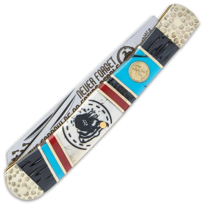 The Kissing Crane 2021 Trail of Tears Trapper makes a great gift for the historical knife collector or Native American collectibles enthusiast. The trapper has two sharp 440 stainless steel blades, which feature the Trail of Tears themed etchings and our limited edition stamp. The handle has a white bone panel with a Native American woman carved into it, accented with turquoise and black jigged bone panels and bands of real exotics, separated by brass spacers. Brass-plated pins, hammered bolsters and the classic Kissing Crane cast shield complete this exquisite design. Each one is laser serialized on the bolster.