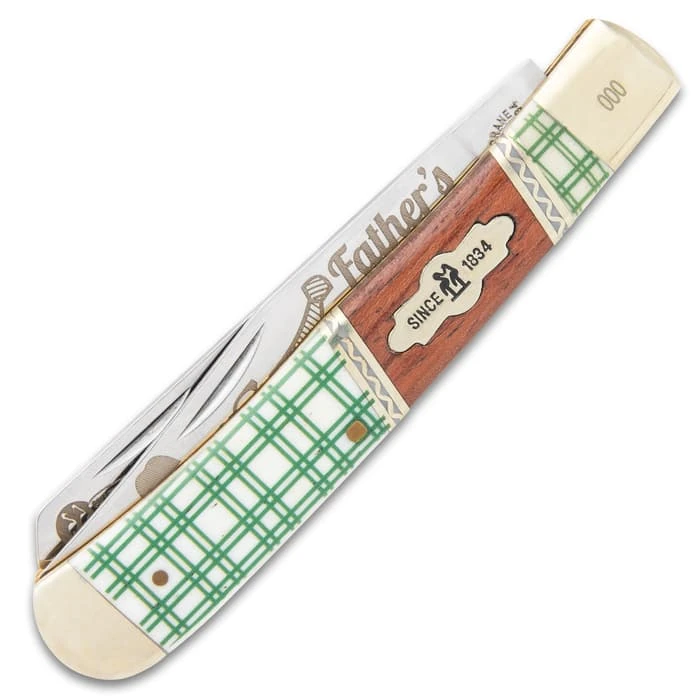 Honor your dad this year with the handsome Kissing Crane 2022 Father’s Day Trapper Pocket Knife. The pocket knife has two stainless steel blades that are etched with a Father’s Day message and 2022 Father’s Day artwork. The handle scales are white bone with a green plaid etching and brown wood, complemented by nickel silver bolsters. The trapper knife is 4”, when closed, and the handle features brass liners and the classic Kissing Crane shield.
