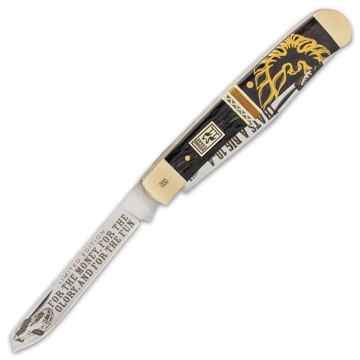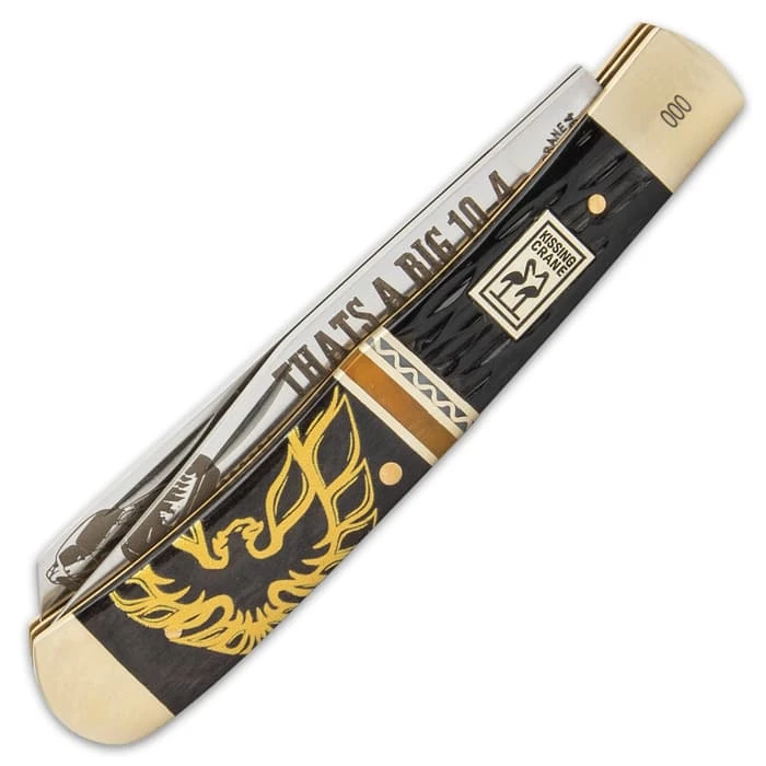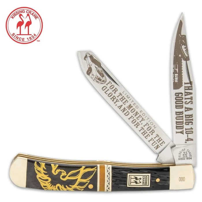 If you grew up in the Seventies, the Kissing Crane Bandit’s Firebird Trapper is a must-have nostalgic collectible. The trapper has two sharp 440 stainless steel blades, which feature CB and Firebird themed etchings and our limited edition stamp. The handsome genuine bone handle is done in black with a yellow firebird, accented with a jigged bone panel and a white band, separated by brass spacers. Brass-plated pins, bolsters and the classic Kissing Crane cast shield complete this exquisite design. Each one is laser serialized on the bolster.