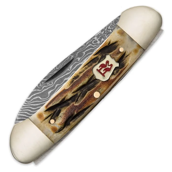 Experience the unrivaled quality of Kissing Crane knives first-hand with our Burnt Bone Canoe Pocket Knife. It has classic-looking genuine burnt bone handle scales to contrast with the hefty, non-traditional shape of the pocket knife. It is accented by nickel silver bolsters and brass pins, and features two razor-sharp Damascus steel blades with convenient nail nicks for ease of opening.