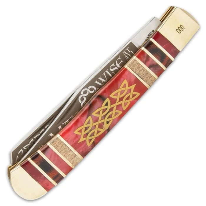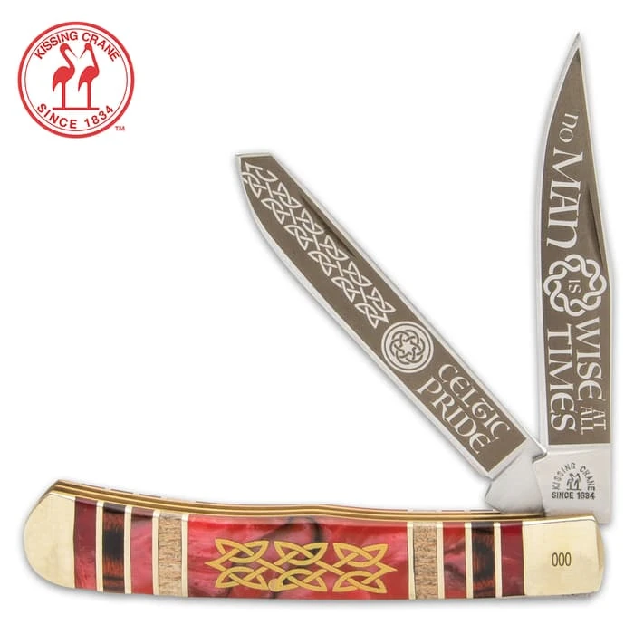 Commemorate your Celtic heritage and pride with the Kissing Crane Celtic Blood Trapper, an heirloom quality knife worthy of any Irishman. It has keenly sharp and resilient 440 stainless steel clip and spey blades, laser etched with Celtic-themed art and text. The handle scales are comprised of a burgundy acrylic panel etched with Celtic knotwork, accented with different colors of wooden bands, separated by stainless steel spacers. Nickel silver bolsters and a brass liner complement the distinctive handle scales and one of the bolsters is individually serialized. The trapper pocket knife is 4 1/2”, when closed, and the cast Kissing Crane assures you of the quality craftsmanship.