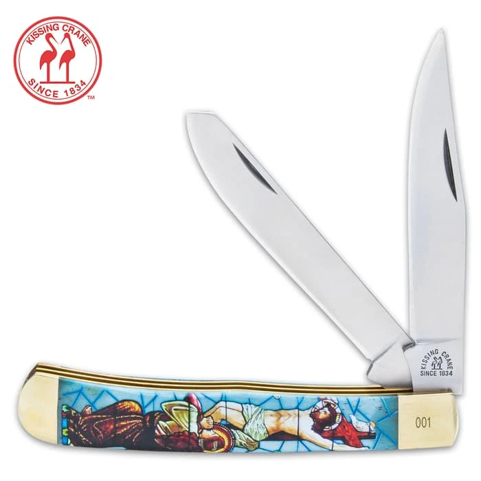 Experience the unrivaled quality of Kissing Crane knives first-hand with the Crucifixion Stained Glass Trapper Knife. It has two sharp 440 stainless steel blades with nail nicks for easy opening and the classic Kissing Crane logo. The handle scales are blue bone with 3D printed, stained glass artwork of the Crucifixion and also features gleaming brass liners. The trapper pocket knife has a 4″ closed length, and the handle features polished nickel silver bolsters. Kissing Crane has forged the world’s best pocket knives for more than 180 years, and the Crucifixion Stained Glass Trapper is no exception. You’re getting only the sharpest pocket knife on the market – both in look and feel!