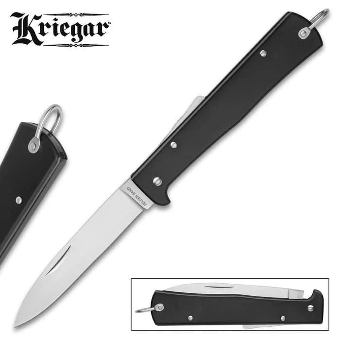Kriegar’s “Helden Rand” Kat Knife pays homage to a classic German military lockback folder – a favorite of troops hunkered in the harrowing trenches of World War I, on the killing fields of WWII and beyond. Slim, easy to carry and exceptionally rugged, the knife proved so valuable, it was even adopted by opposing forces and continues to be a military workhorse into the present day. Try Kriegar’s modern reproduction, and it’s easy to see why! Its blade is hard, resilient carbon steel, honed to a razor sharp edge. The drop point profile is exceptionally versatile, and the sturdy lockback offers added safety and the rock-solid stability of a fixed blade – vital for especially vigorous cutting jobs. More than a mere “historical replica,” the Helden Rand – which translates to “hero’s edge” in German – boasts the same level of dependability, strength and utility as the original. It’s the ultimate discreet, easy-to-carry folder for all your cutting needs!