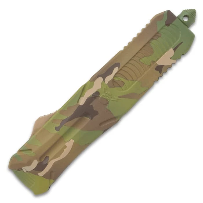 M48 Camo Automatic OTF Knife – Stainless Steel Blade, Cerakote Coated TPU Handle, Slide Trigger, Pocket Clip – Length 9 1/2″