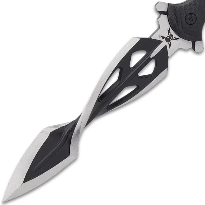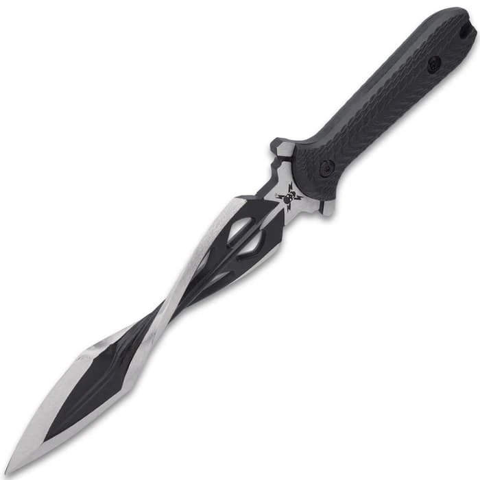 From the rockstars at M48, the design geniuses who gave you the Cyclone, comes the M48 Tsunami Dagger. The exclusive blade has a twist, which positions the edges perfectly for maximum damage and it narrows to a penetrating point. In addition, the overall weight of the dagger is reduced by the partial skeletal design of the blade. The twisting, 7 1/2” 2Cr13 stainless steel blade has a two-tone satin and black oxide-coated finish. The handle scales are crafted of injection-molded nylon fiber with a grooved EDM surface texture for a slip-free grip. The 12 1/4” overall dagger slides into a custom Vortec belt sheath that fits like a glove and is virtually indestructible.