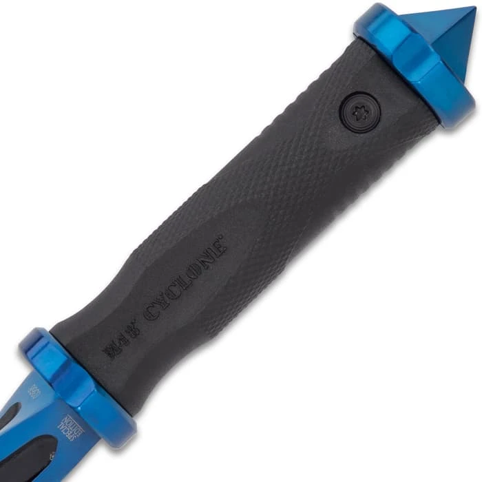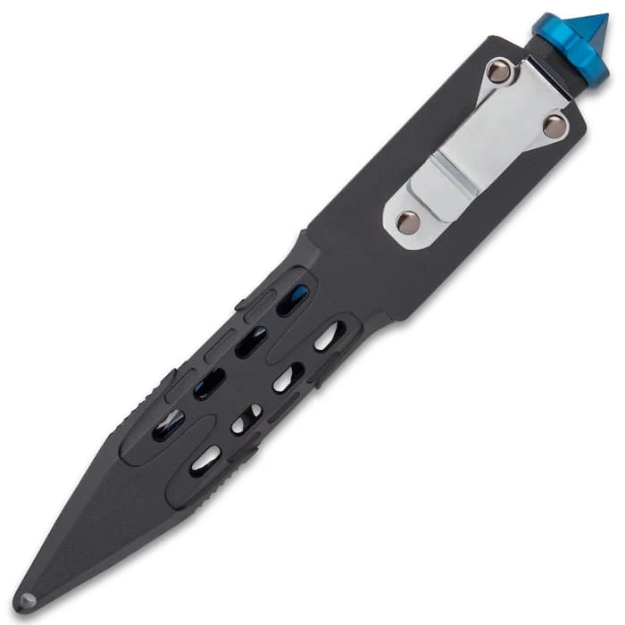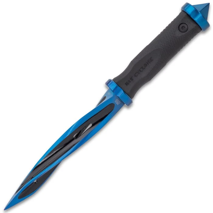 So, meet United Cutlery’s new M48 Tsunami Force Cyclone Boot Knife! The 5 3/4” cast stainless steel blade has been crafted into a tri-edged triumph, using temperatures up to 1,030 degrees, which gives it a 48HC. The three, blue and black, spiraling cutting edges come down to an incredibly sharp piercing point. As with all M48 knives, the glass-fiber-reinforced nylon handle gives you a strong and secure grip. The boot knife also features a solid stainless steel hand guard and skull crusher pommel. The blade slides into a custom Vortec belt sheath that fits like a glove and is virtually indestructible.